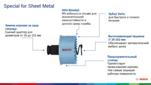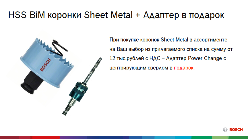 При покупке коронок Sheet Metal в ассортименте на Ваш выбор из прилагаемого списка на сумму от 12 тыс.рублей с НДС – Адаптер Power Change с центрирующим сверлом в подарок.
