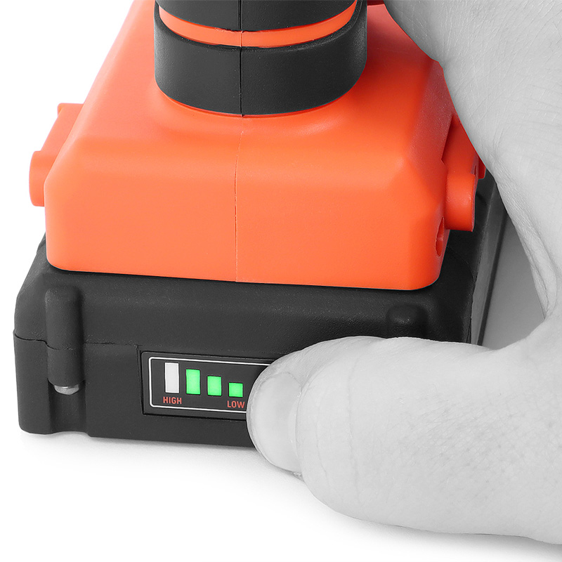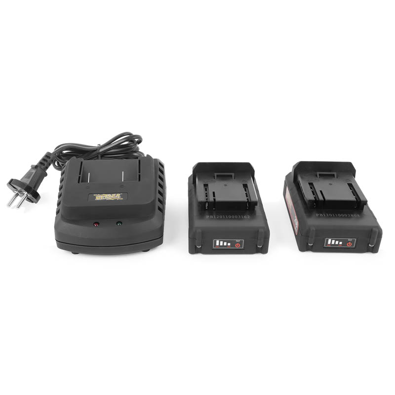 Заклепочник комплектуется двумя LI-iON аккумуляторами 20В емкостью 2Ач, а также быстрым зарядным устройством. Время зарядки — 60 минут. Аккумуляторы заклепочника оснащены четырехуровневой индикацией заряда.