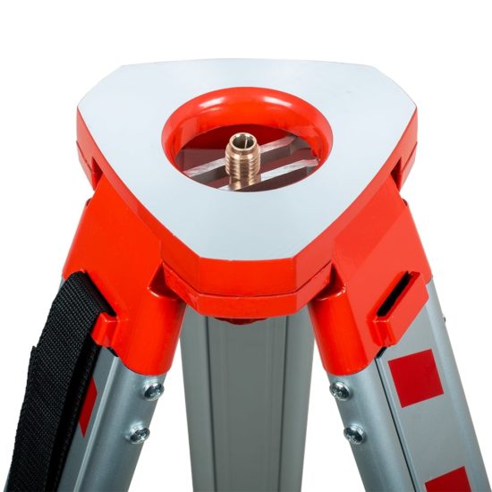 Некоторые элементы конструкции окрашены в яркий оранжевый цвет, а на стойки нанесены контрастные полосы. Такое оформление делает треногу более заметной и повышает безопасность изысканий на стройплощадке, а также сохранность дорогостоящих измерительных устройств.