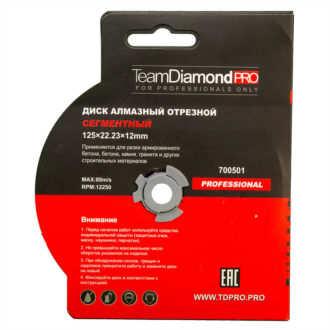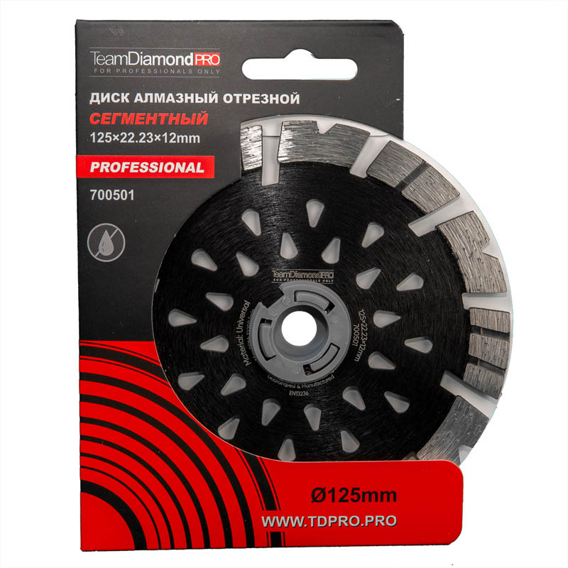 Диски серии TeamDiamondPro Master Plus это универсальный диск с отличными показателями скорости работы по большинству строительных материалов. Перфорированный корпус и сегменты увеличенной высоты и особый формы отвечают за лучшее охлаждение диска, что важно при работе с твердыми материалами. диск подходит для использования на углошлифмашинах и специальных отрезных станках.