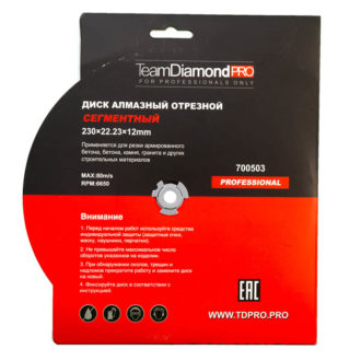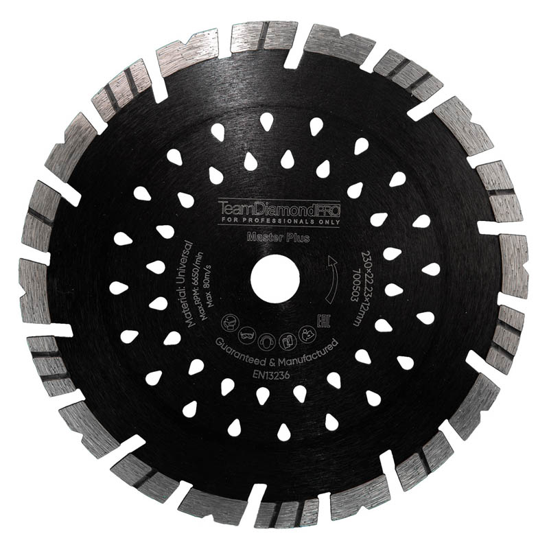 Диски серии TeamDiamondPro Master Plus это универсальный диск с отличными показателями скорости работы по большинству строительных материалов. Перфорированный корпус и сегменты увеличенной высоты и особый формы отвечают за лучшее охлаждение диска, что важно при работе с твердыми материалами. диск подходит для использования на углошлифмашинах и специальных отрезных станках.