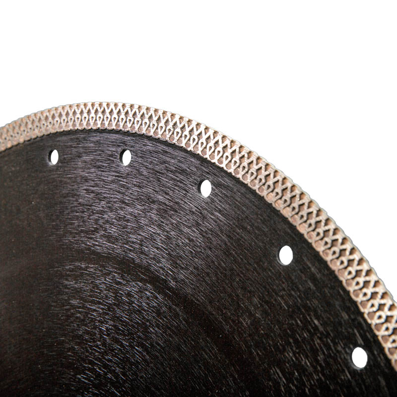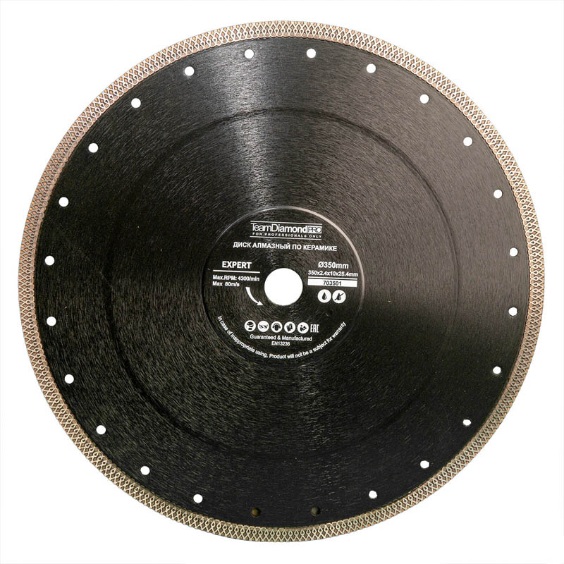 Диск алмазный толщиной 2.4 мм для работ по керамограниту и керамике. Высота алмазного слоя 10 мм. Х-образная режущая кромка позволяет резать без применения воды. Фланец на корпусе диска для дополнительной жесткости корпуса и тонкая режущая кромка обеспечивают чистый рез без сколов. Технология производства: горячее прессование.