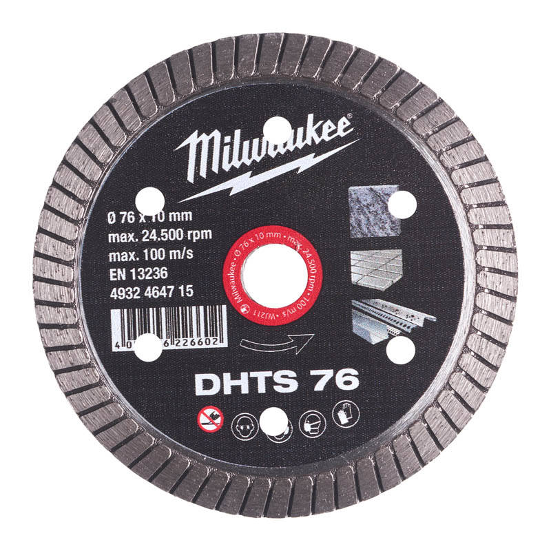 - Диски с замкнутой кольцевой кромкой, экстра тонкие, толщина сегмента (DHTS 115 = 1,7 мм, DHTS 125/ DHTS 230 = 1,8 мм) для очень быстрой и чистой резки без искр в тонких материалах таких как гранитная и мраморная плитка.