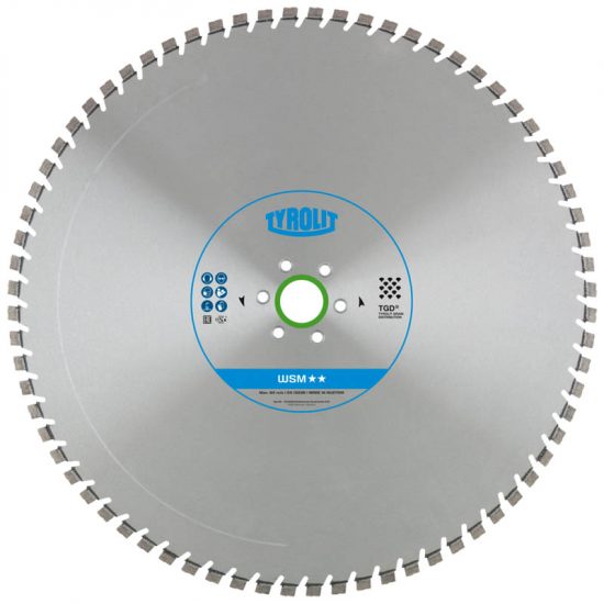 Алмазные диски для стенорезных систем Tyrolit серии TGD созданы с использованием технологии TGD (Tyrolit Grain Distribution), которая даёт возможность резать базовый материал с постоянно высоким уровнем производительности, благодаря равноудалённому расположению алмазов в сегментах. Исключительно высокая скорость резки и высокая долговечность при работе на любом материале, включая тяжелоармированный бетон. Диски типа WSM рекомендуются для машин мощностью от 15 кВт.