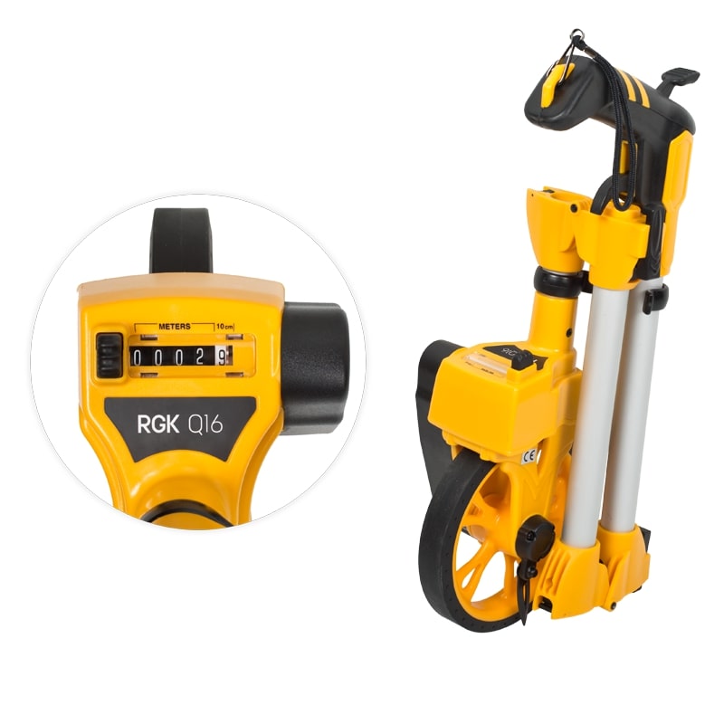 Дорожное колесо RGK Q16 диаметром 160 мм и измеряет расстояния там, где невозможно или нецелесообразно применять мерные ленты или лазерные дальномеры, например, при разметке дорожного полотна или фиксировании параметров при ДТП. Прибор удобен при измерениях при неблагоприятных погодных условиях за счет надежного механического счетчика.