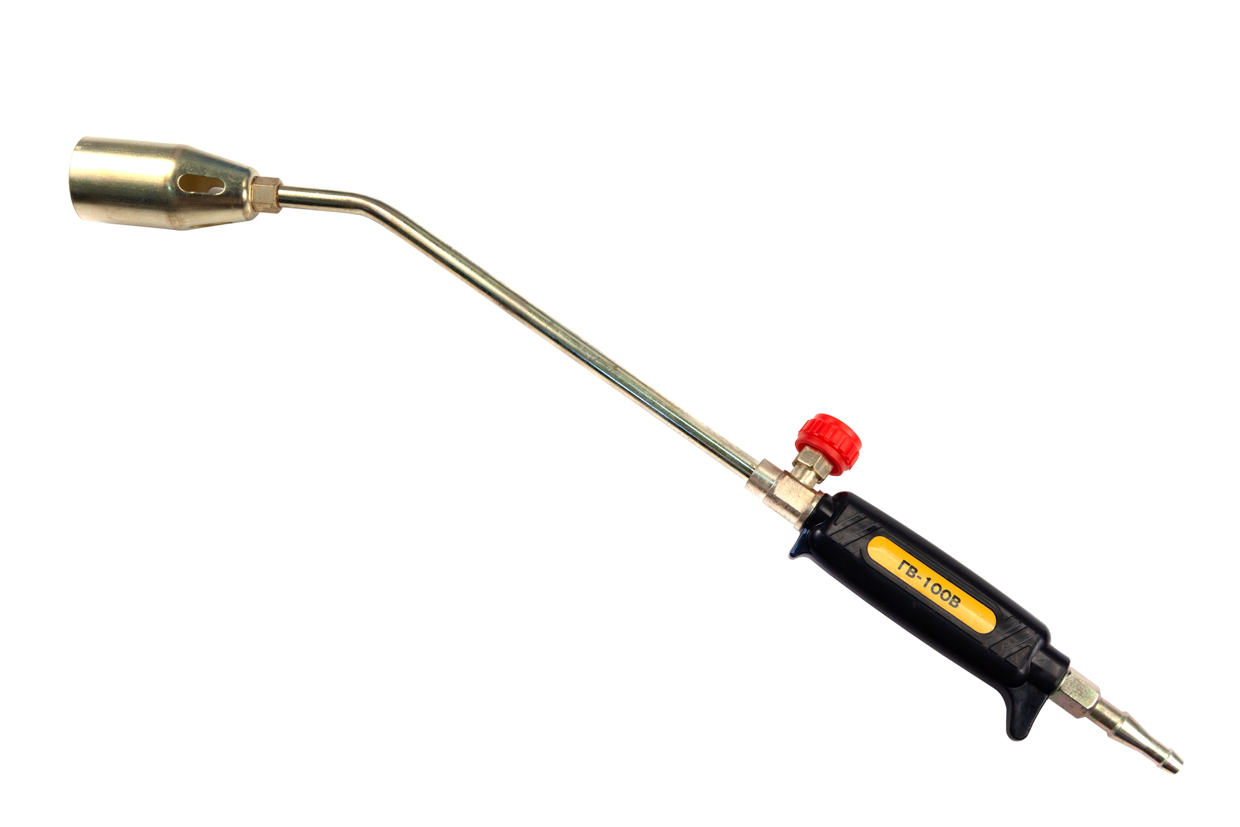 Горелка газовоздушная ГВ-100В с клапаном и регулировочным вентилем инжекторного типа предназначена для нагрева изделий из черных и цветных металлов, неметаллических материалов, а также для оплавления поверхности битумного рулонного материала при производстве гидроизоляции. Применяется для нагрева при сгибе пластмассовых труб, сушке железобетонных панелей, литейных форм, кирпичной кладки и других работ. В качестве горючего газа применяется пропан-бутановая смесь.