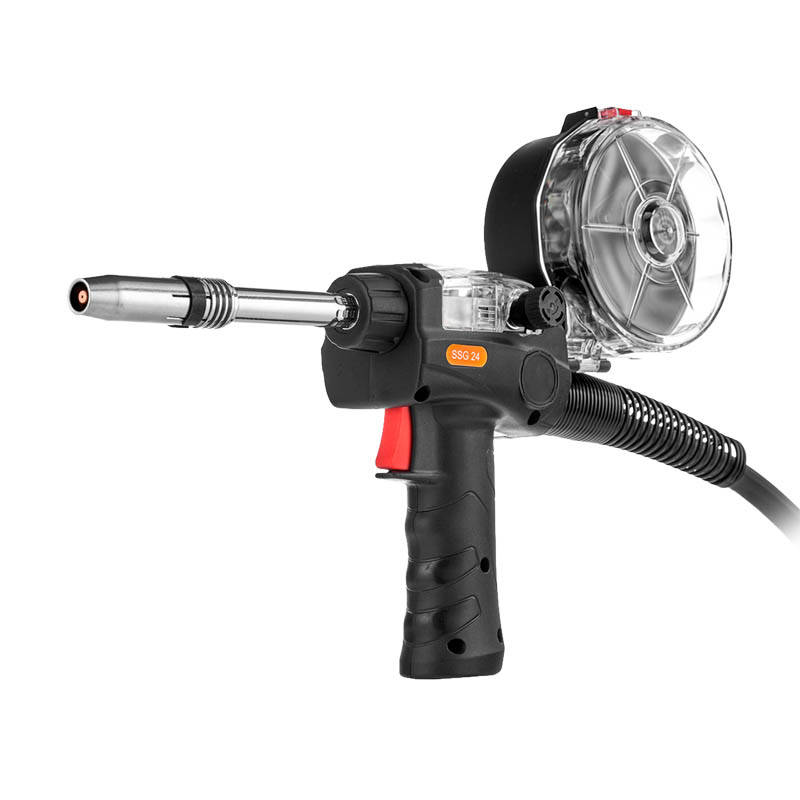Сварочная горелка для полуавтоматической сварки типа Spool Gun имеет встроенный механизм подачи сварочной проволоки и предназначена для полуавтоматической сварки в среде защитных газов, углеродистой, нержавеющей, алюминиевой и порошковой самозащитой сварочной проволокой.