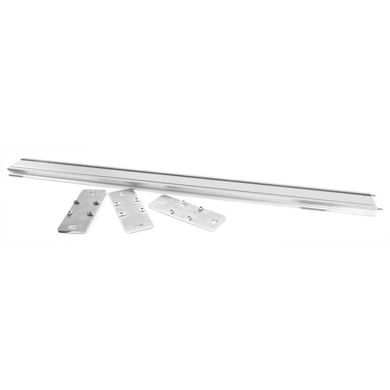 Две шины длиной 1,2 метра каждая, позволяют соединить их и получить направляющую в 2,4 метра. Ширина направляющей шины 90 мм., а дина монтажной пластины (для крепления шины к поверхности разрезаемого объекта) 225 мм.