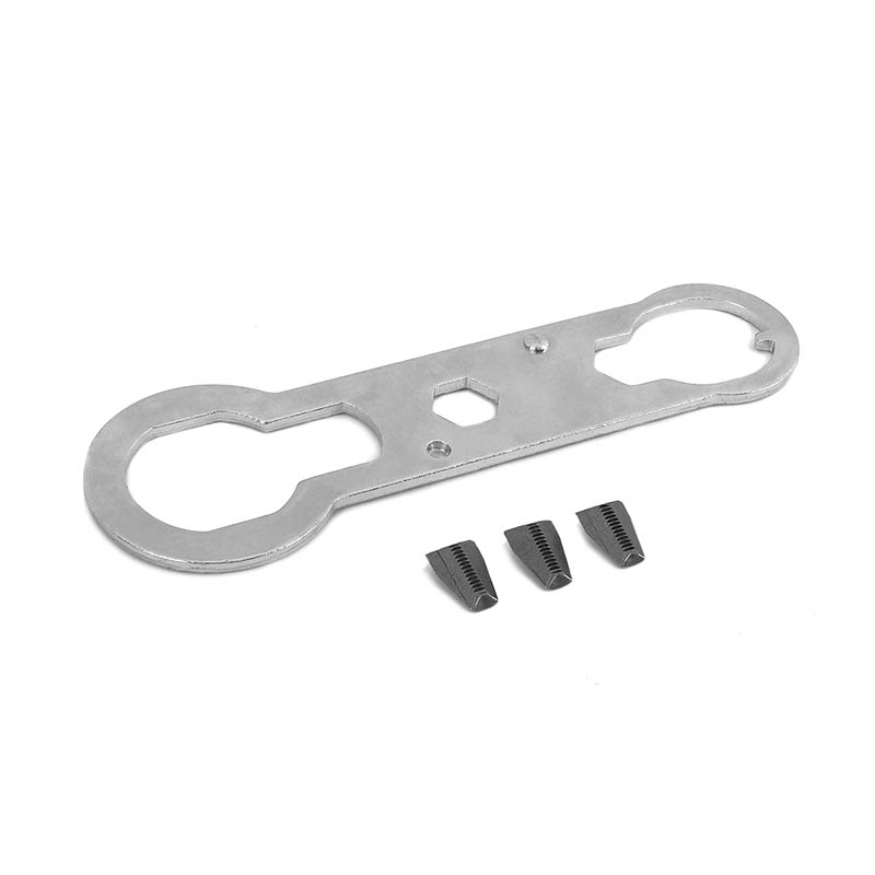 Заклепочник поставляется в картонной коробке в комплекте с тремя сменными насадками, тремя запасными вытяжными губками и комбинированным ключом.