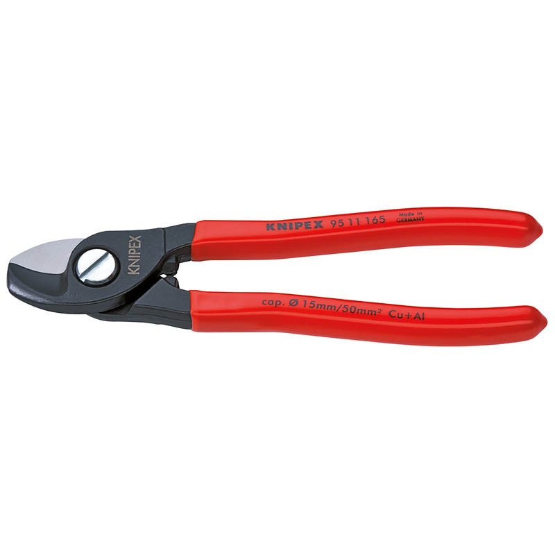 95 11 165 Кабелерез для реза медного и алюминиевого кабеля, одно- и многожильного. Режут гладко и чисто, без деформации материала. Не подходит для стальной проволоки и твёрдотянутых медных проводников. закаленные режущие кромки с прецизионной шлифовкой. легко резать одной рукой. с защитой для рук. регулируемый шарнир, винтовой, самофиксирующийся. — Параметры режима резки: медный кабель, многопроводный: 50mm² — Параметры режима резки: медный кабель, многопроводный: Ø 15mm — AWG: 1 / 0