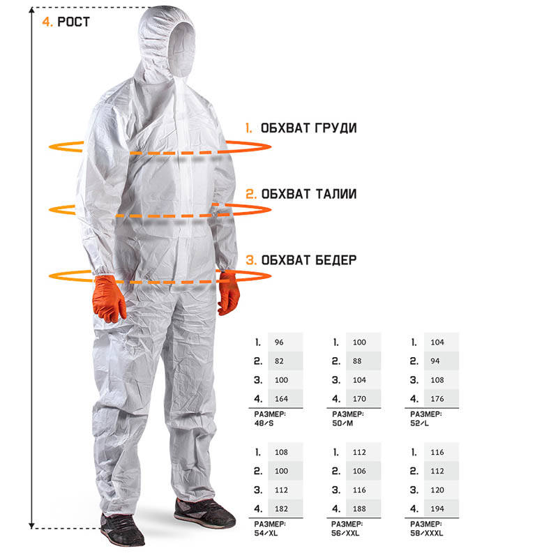 Комбинезон предназначен для защиты от брызг жидкостей, кислот, щелочей, масел, воды, а также пыли и твердых частиц.