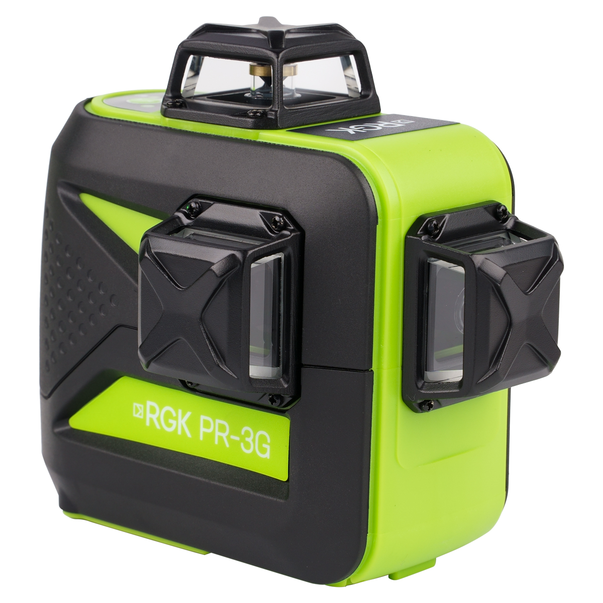 Лазерный уровень RGK PR-3G проецирует горизонтальную и 2 вертикальные линии. Лазерный луч зеленого цвета хорошо различим при ярком солнечном освещении и на поверхностях темного цвета.