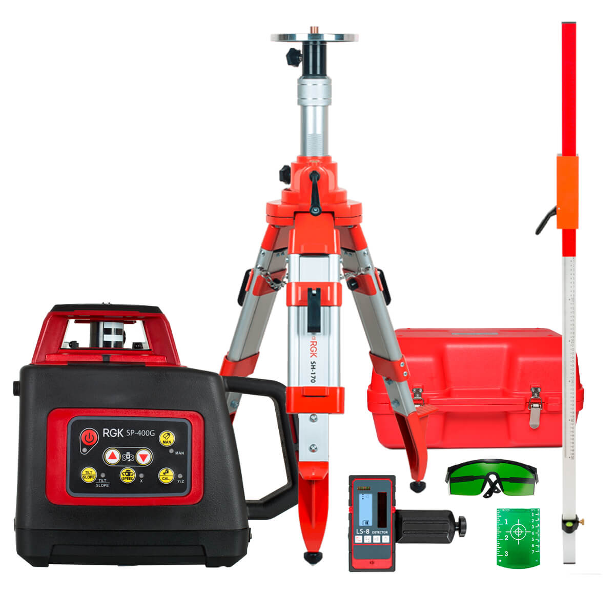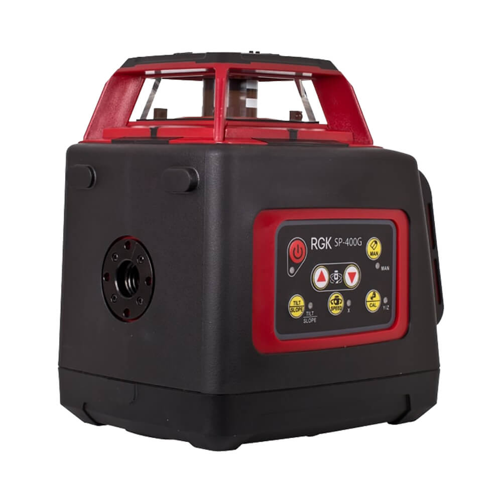 Ротационный лазерный уровень RGK SP-400G – профессиональный прибор для нивелирования как на открытых площадках, так и в помещениях. В отличие от многих приборов в своем ценовом сегменте, он позволяет работать и с горизонтальной и с вертикальной плоскостью. Также возможен режим наклонной плоскости.