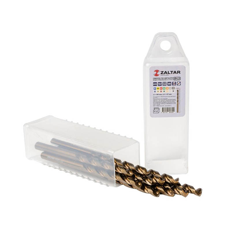 Комплект свёрл по металлу индустриальных Zaltar 10 шт, DIN 338, HSS-E Co5, Тип VA, 5xD, Ø4.50 мм