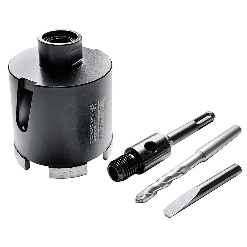 В состав набора входит: алмазная коронка, держатель М16 с хвостовиком SDS-plus, центрирующее сверло.