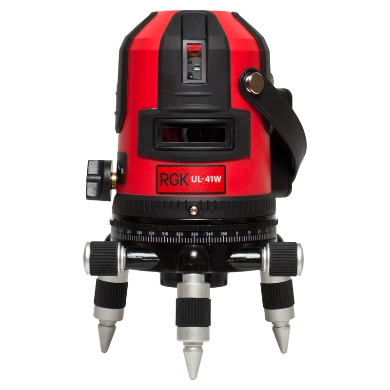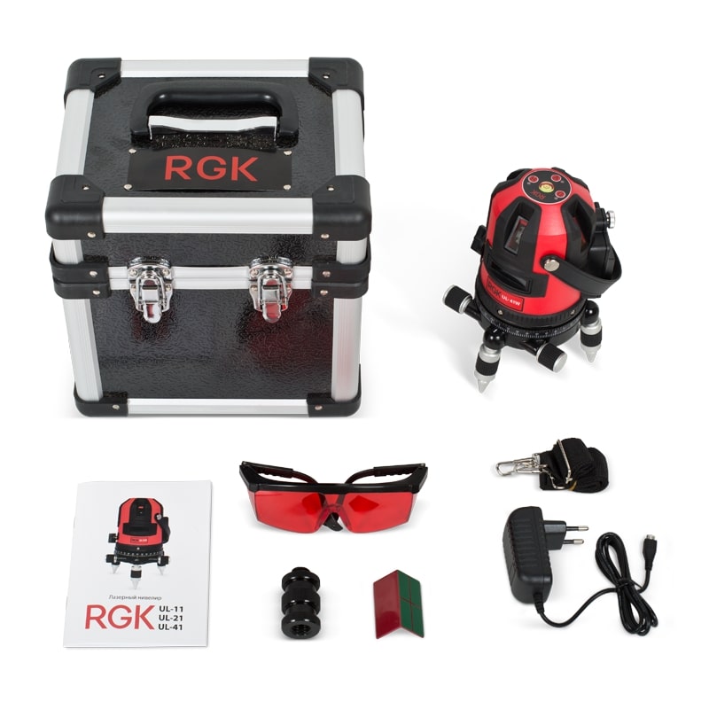RGK UL-41 строит четыре вертикальных плоскости и горизонтальную с развёрткой 110°, благодаря чему устройство может охватить все стены помещения с одной позиции. Поворотный корпус UL-41 с двумя винтами наводки снабжен горизонтальным лимбом и позволяет аккуратно и точно перенести плоскость на нужную поверхность. Лазер UL-41 обеспечивает чёткую линию на любой поверхности на дистанции до 20 метров в помещении, а с использованием приемника лазерного излучения дистанция возрастает до 50 метров с возможностью использования прибора при ярком освещении. Точность построения линии составляет 0,2 мм на 1 м.