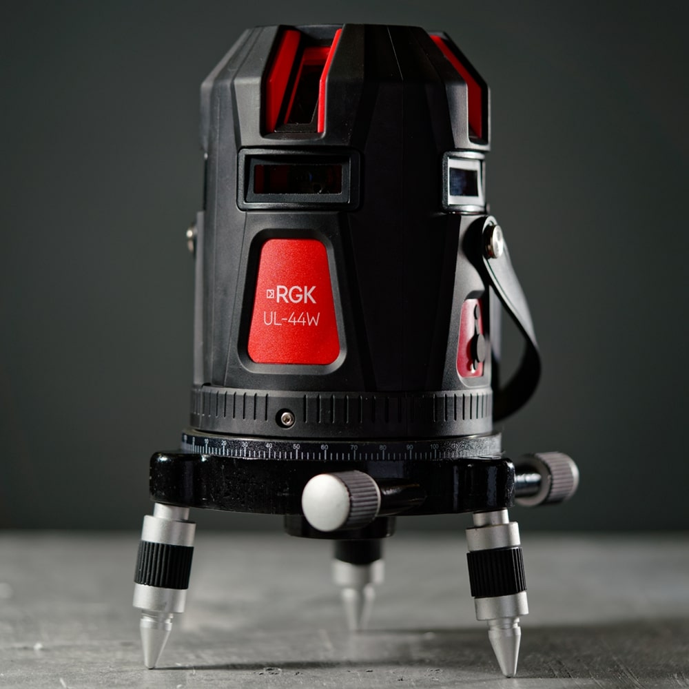 RGK UL-44W снабжён системой самовыравнивания, эффективно устраняющей отклонение по горизонтали до 5°. Благодаря компенсатору на основе сервоприводов нивелир готов к работе сразу после включения и полностью устойчив к вибрации, что позволяет без проблем использовать прибор в условиях стройки или ремонта. Устойчивость нивелира на любой поверхности обеспечивается металлическим трегером, плавные винты которого позволяют вручную выровнять устройство при необходимости. Лазерный отвес помогает установить нивелир на точке измерения.