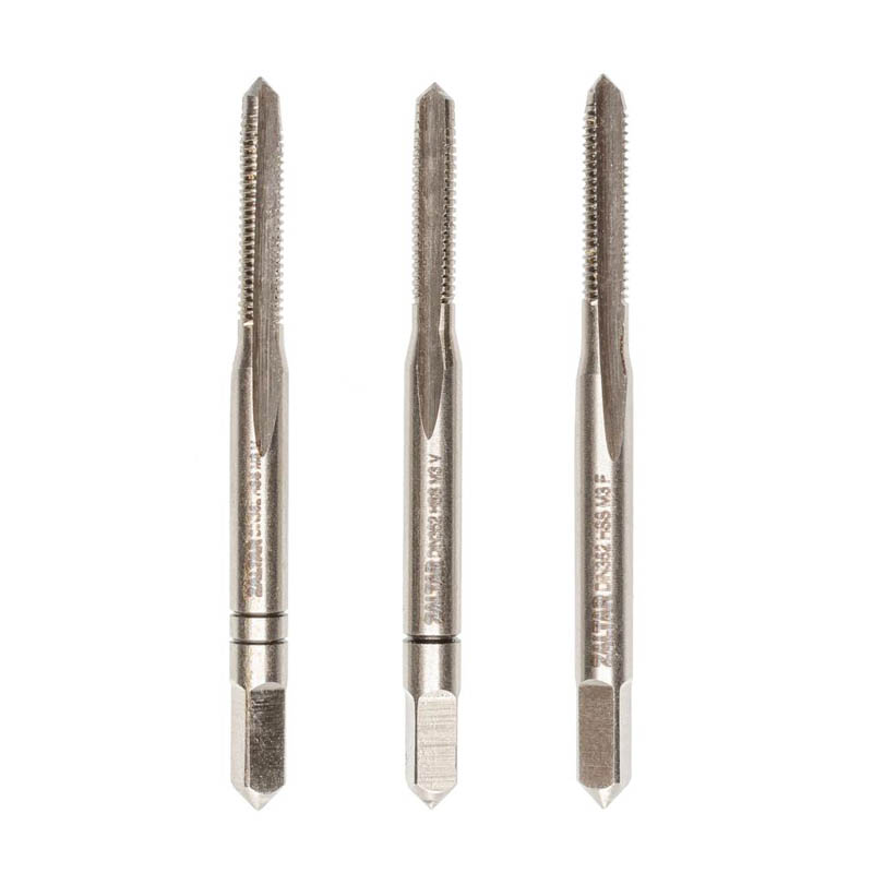 Формирование резьбы происходит в 3 этапа: сначала черновым метчиком #1 (6-8 ниток на заход), затем чистовым #2 (4-5 ниток на заход) и финишным #3 (2-3 нитки на заход). Благодаря этому, снижается усилие, прилагаемое к каждому метчику, а резьба получается более точная и чистая.