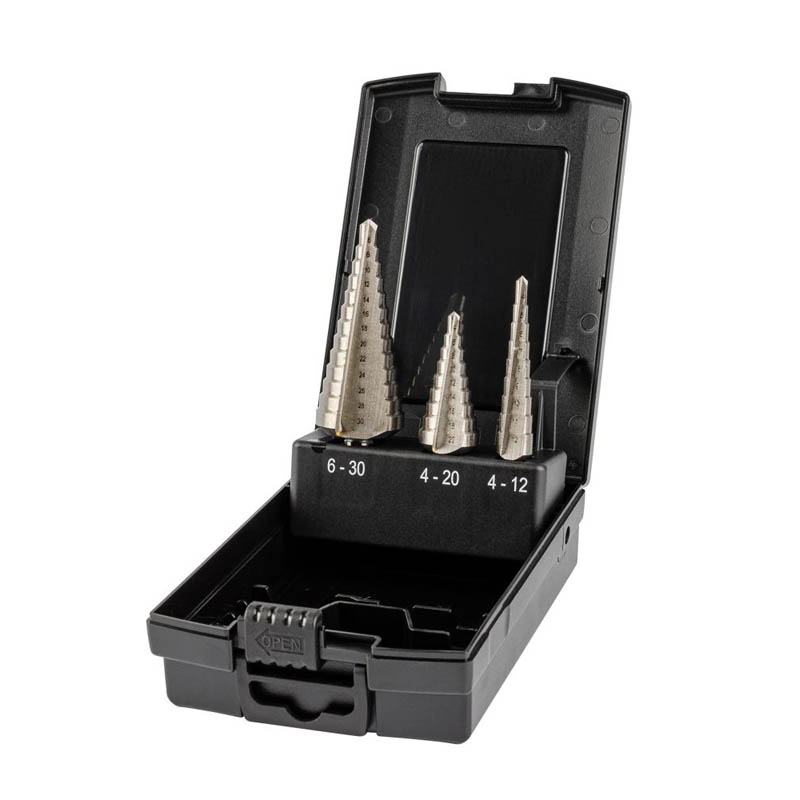 Набор свёрл ступенчатых Zaltar 3 пр., HSS, Gr.1/2/3, Ø4-12, 4-20, 6-30 мм, прямая канавка, трёхплоскостной хвостовик