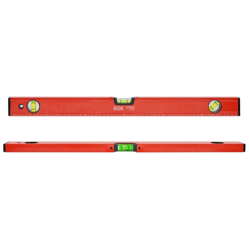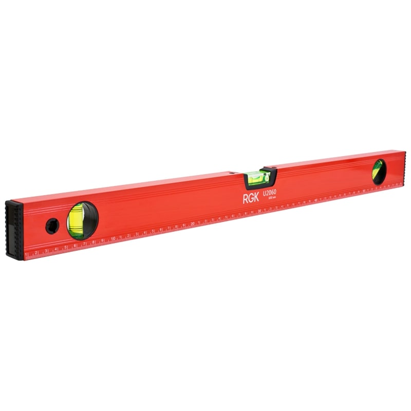 Строительный уровень RGK U2060 длиной 60 сантиметров оснащен тремя ампулами, расположенными горизонтально, вертикально и под углом 45°. Боковые пластиковые вставки защищают уровень при падении.