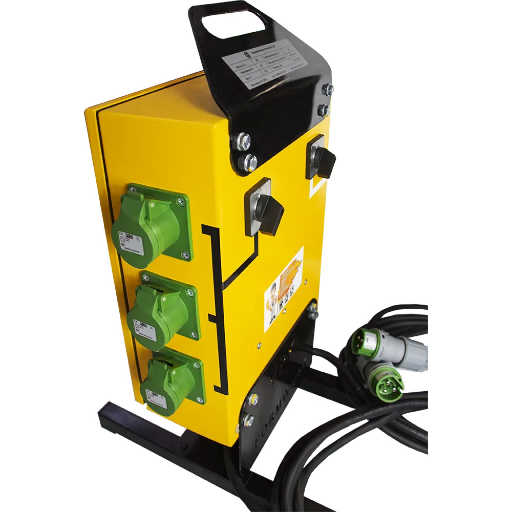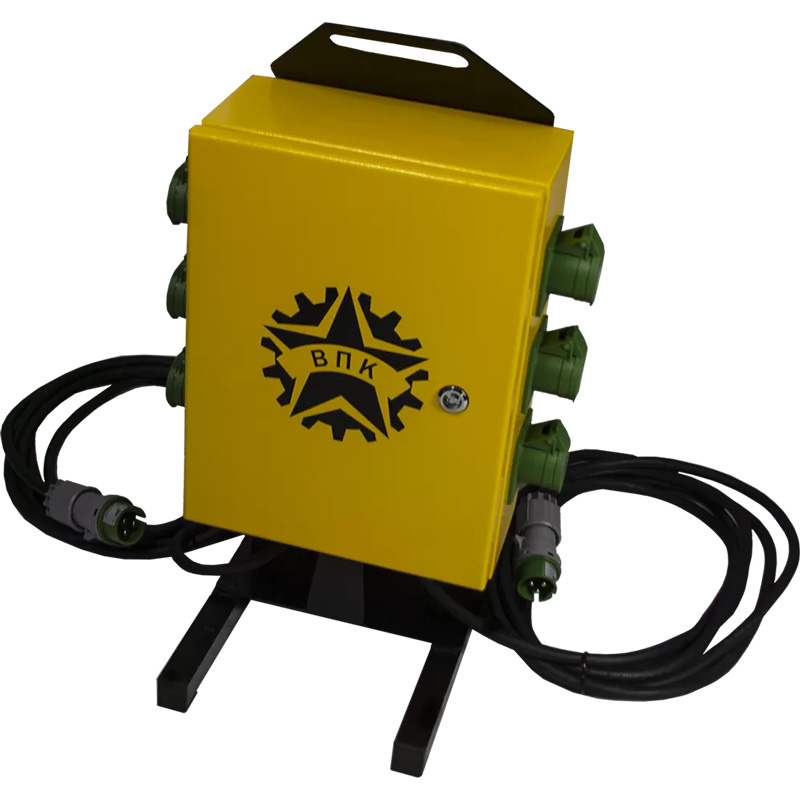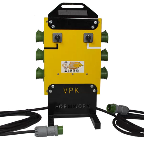 Разветвитель VPK Formwork 2/6 предназначен для подключения до 6-ти внешних вибраторов. Представляет собой коммутационное устройство с возможностью работы как от 1-ого преобразователя частоты, так и одновременно от 2-х независимых преобразователей. Для этого на входе имеются два кабеля с вилками 42В и 200 Гц. Минимальный ток каждой линии должен составлять 20 А. Каждый из двух кабелей питает группу розеток (3 шт) через переключатель для подключения шести внешних вибраторов.