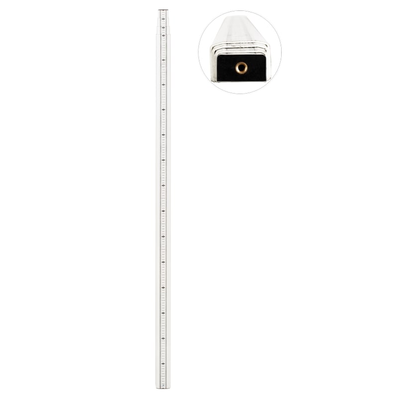 Торцы рейки защищены крепкими пластиковыми заглушками, предохраняющими конструкцию от падений и истирания при контакте с бетоном или гравием. Обе измерительные шкалы долговечны, не выцветают и хорошо противостоят износу.