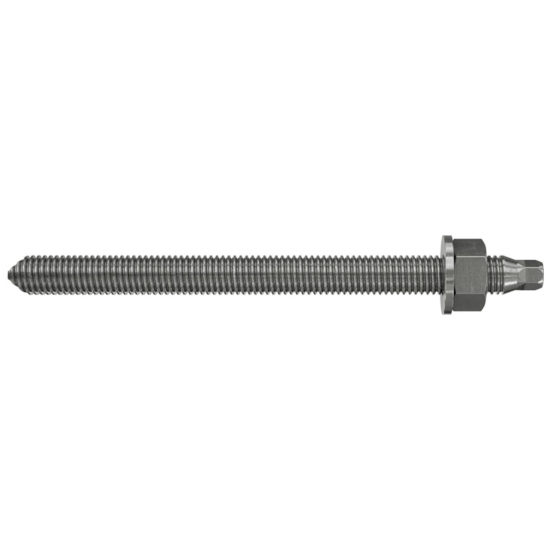 Резьбовая шпилька RG M является системным компонентом для крепления с помощью химических капсул RSB и RM II и инъекционных составов FIS SB, FIS EM Plus, FIS V, FIS VL для применения в бетоне. Благодаря заостренному торцу она особенно подходит для использования с капсулами RSB и RM II. Обширный ассортимент диаметров M8 — M30 и различных марок стали позволяет решать самые разнообразные задачи. Система особенно подходит для экономичного крепления ограждений, металлоконструкций и рекламных щитов как внутри, так и снаружи помещений. Резьбовая шпилька RG Mустанавливается ударно-вращательным движением с помощью перфоратора и соответствующего монтажногоинструмента. В процессе установки заостренный торец шпильки RG M разбивает капсулу, перемешивает и активирует состав. Допуски на применение различных химических капсул и инъекционных составов должны быть соблюдены.