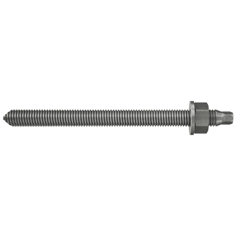 Резьбовая шпилька RG M является системным компонентом для крепления с помощью химических капсул RSB и RM II и инъекционных составов FIS SB, FIS EM Plus, FIS V, FIS VL для применения в бетоне. Благодаря заостренному торцу она особенно подходит для использования с капсулами RSB и RM II. Обширный ассортимент диаметров M8 — M30 и различных марок стали позволяет решать самые разнообразные задачи. Система особенно подходит для экономичного крепления ограждений, металлоконструкций и рекламных щитов как внутри, так и снаружи помещений. Резьбовая шпилька RG Mустанавливается ударно-вращательным движением с помощью перфоратора и соответствующего монтажногоинструмента. В процессе установки заостренный торец шпильки RG M разбивает капсулу, перемешивает и активирует состав. Допуски на применение различных химических капсул и инъекционных составов должны быть соблюдены.