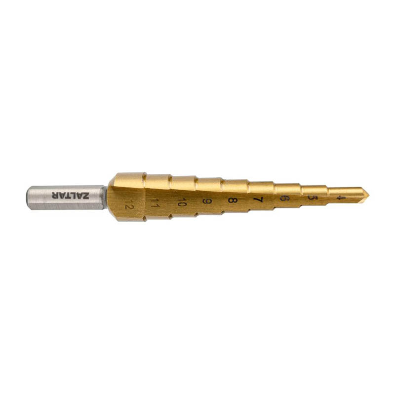 Сверло ступенчатое Zaltar HSS TiN, Gr.1, Ø4-12 мм, прямая канавка, трёхплоскостной хвостовик