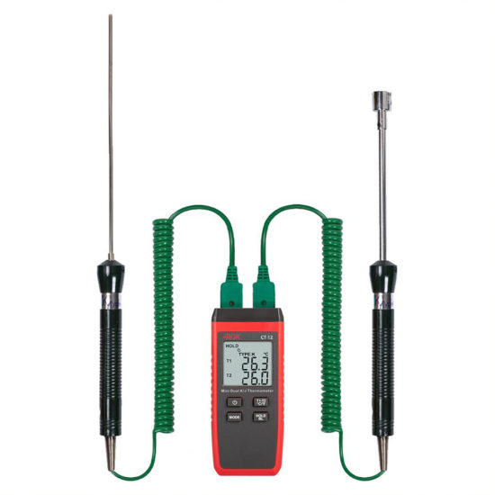 Специальная индикация оповещает специалиста о ненадлежащем подключении или неисправности термопары. Двухканальный цифровой термометр RGK CT-12 с погружным зондом температуры TR-10W и поверхностным зондом TR-10S также сообщает о превышении предела измерений и низком уровне заряда элементов питания. Измерение пиковой и средней температуры упрощает реализацию различных сценариев проверки, особенно при работе с крупными объектами.