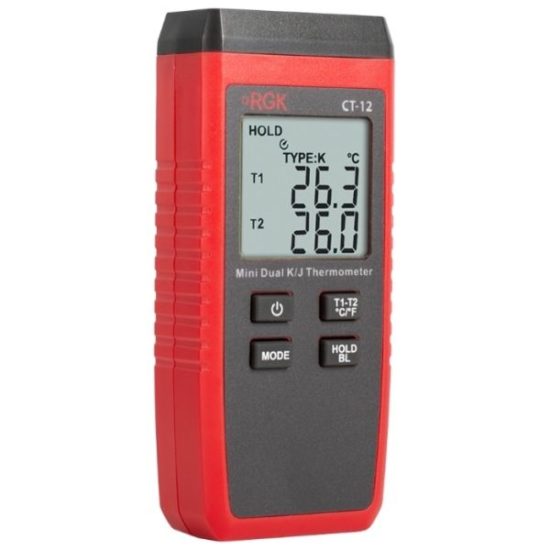 Контактный термометр RGK CT-12 с поверхностным зондом TR-10S с поверкой — это надежный и точный прибор для измерения температуры в диапазоне от -40°С до +500°С с комплектной термопарой. Погрешность при этот составляет не более ± 1,5 °C. Главное преимущество этой модели — 2 гнезда для подключения выносных датчиков с функцией определения разности между каналами.