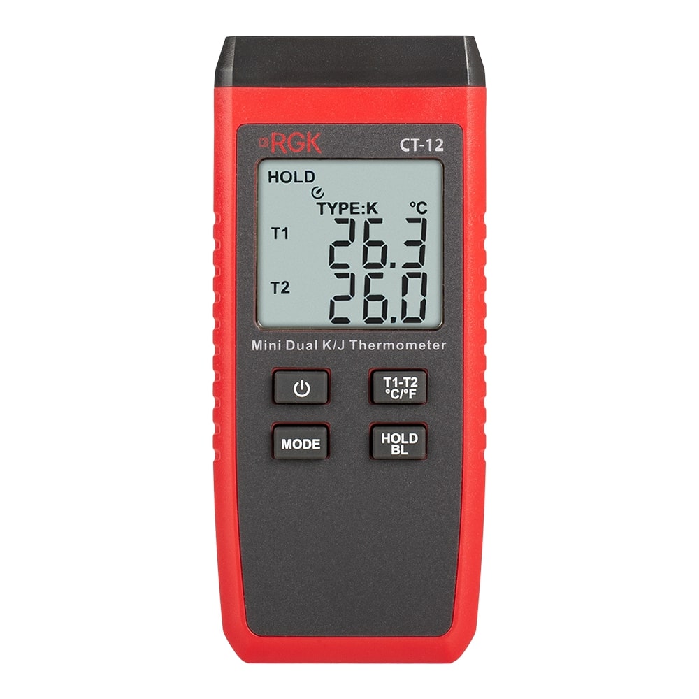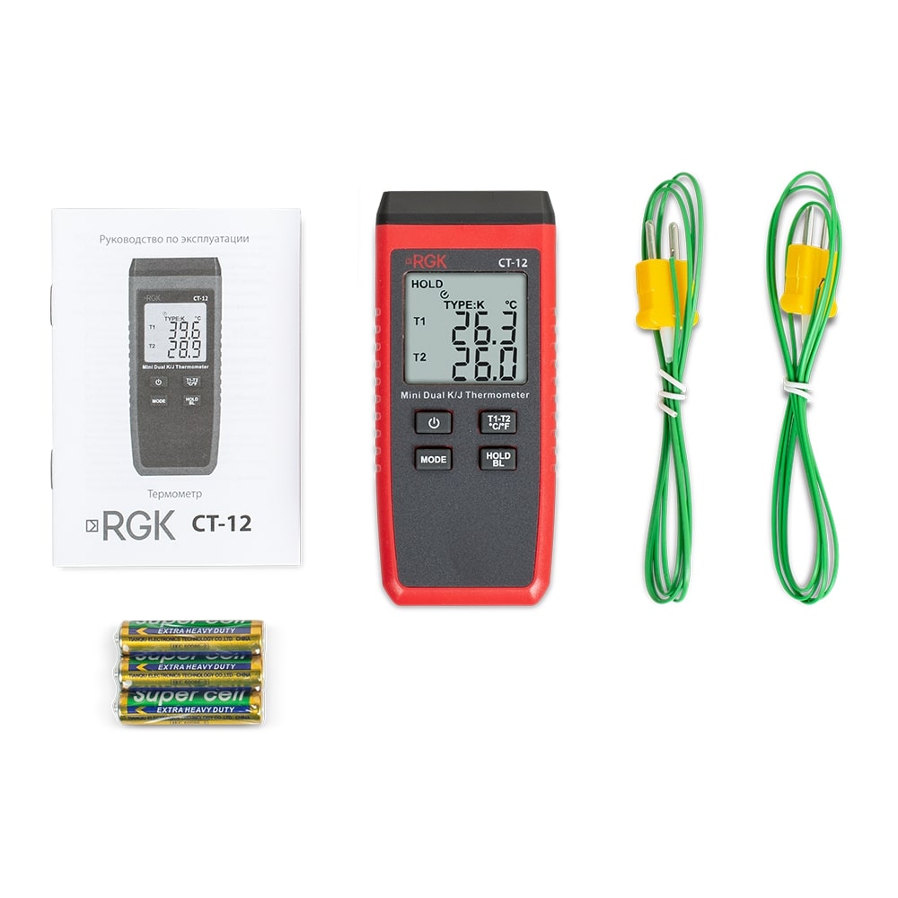 Контактный термометр RGK CT-12 — это надежный и точный прибор для измерения температуры в диапазоне от — 40 °С до + 260 °С с комплектной термопарой. Погрешность при этот составляет не более ± 1,5 °C. Главное преимущество этой модели — 2 гнезда для подключения выносных датчиков с функцией определения разности между каналами.