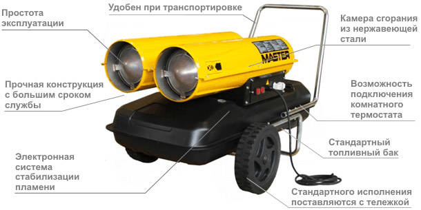 Тепловая пушка MASTER B 300 CED – это высокопроизводительный аппарат для отопления помещений различной площади. Обязательное условие работы – хорошая вентиляция, постоянный доступ к свежему воздуху. Дизельная тепловая пушка прямого нагрева обладает 100% КПД, поэтому отличается экономичностью. Позволяет быстро поднять температуру до нужного уровня и поддерживать ее с минимальными затратами. Незаменима в сельском хозяйстве (обогрев теплиц, сушка зерновых), при обогреве гаражей и СТО, в строительной отрасли (сушка, обогрев площадок и др.). Модель отличается высокой надежностью и безопасностью. Горение управляется электронным модулем, режимы выбираются так, чтобы обеспечить полное сгорание топлива. Предусмотрена защитный модуль, исключающий перегрев. Камера сгорания из нержавейки отделена от наружной оболочки, что исключает вероятность получения ожогов при случайном касании. Корпус покрыт термостойкой и ударостойкой краской.